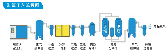 制氧機分離空氣主要由兩個填滿分子篩的吸附塔組成,在常溫條件下,將壓縮空氣經過過濾,除水干燥等凈化處理后進入吸附塔,在吸附塔中空氣中的氮氣等被分子篩所吸附,而使氧氣在氣相中得到富集,從出口流出貯存在氧氣緩沖罐中,而在另一塔已完成吸附的分子篩被迅速降壓,解析出已吸附的成分,兩塔交替循環,即可得到純度為≥90%的氧氣。整個系統的閥門自動切換均由一臺電腦自動控制。